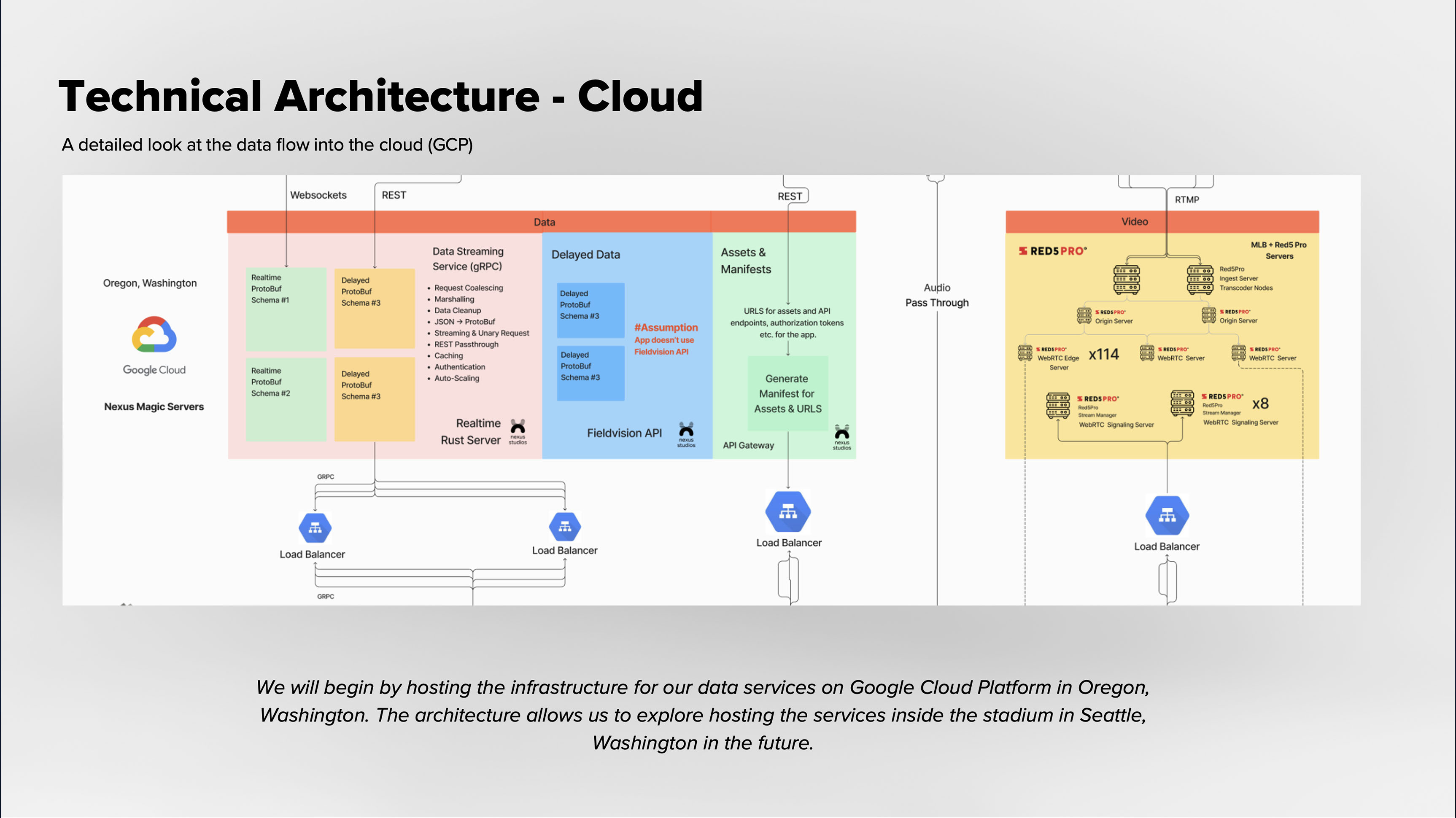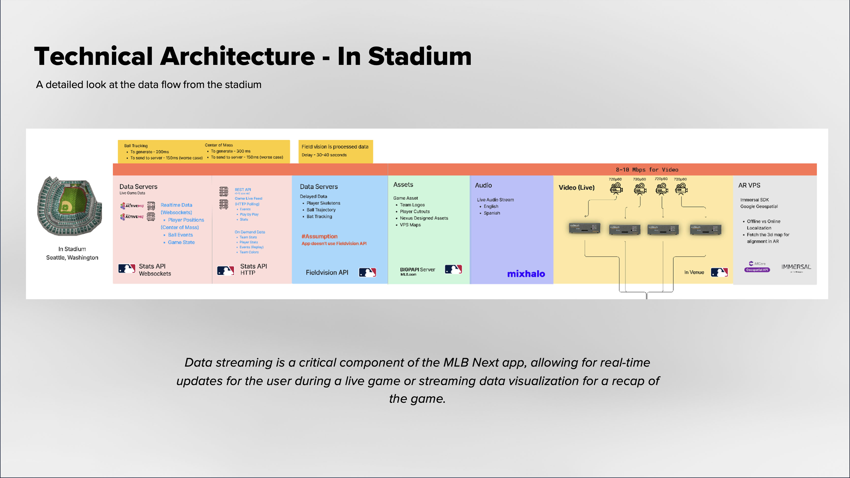 MLB Next set out to close that gap.  In order to do this we  build a system that could get data from the ballpark to the cloud back down to client devices instantly.  This allowed us to deliver real-time data on top of live plays with moving players and create a shared experience that works at stadium scale.
