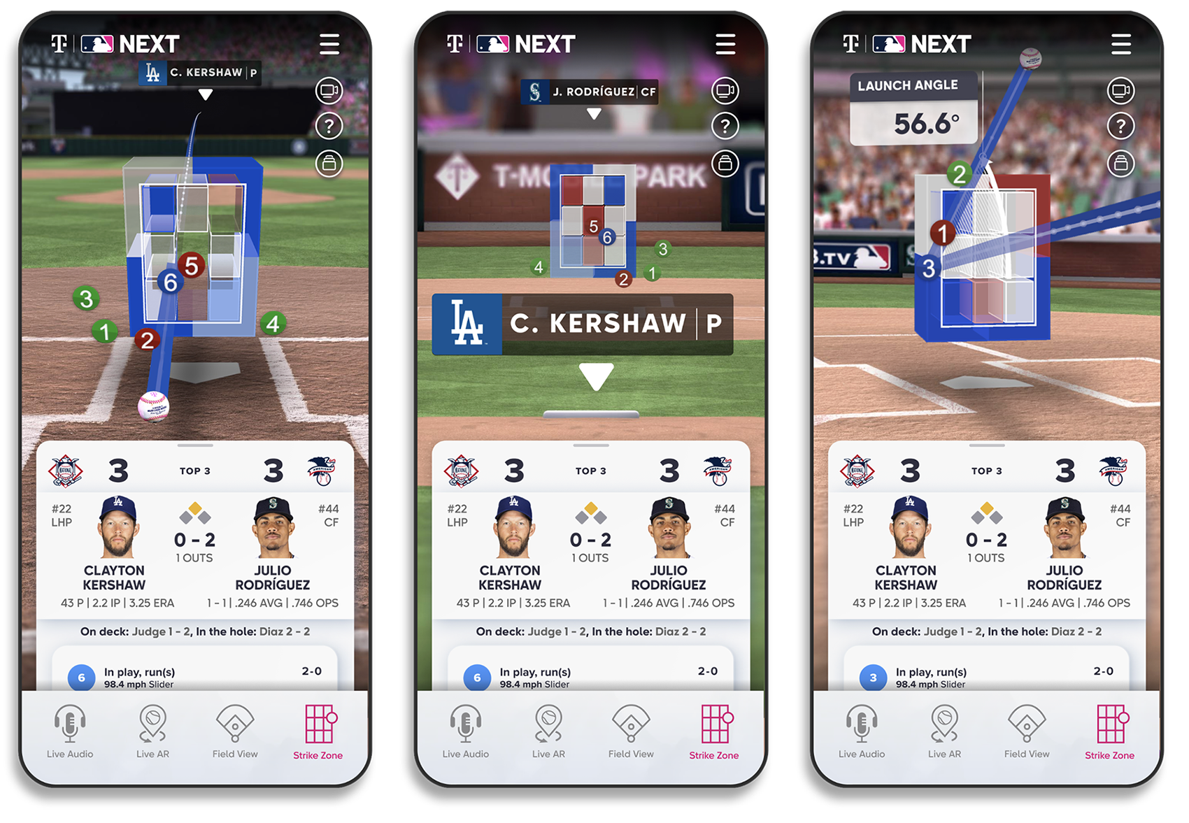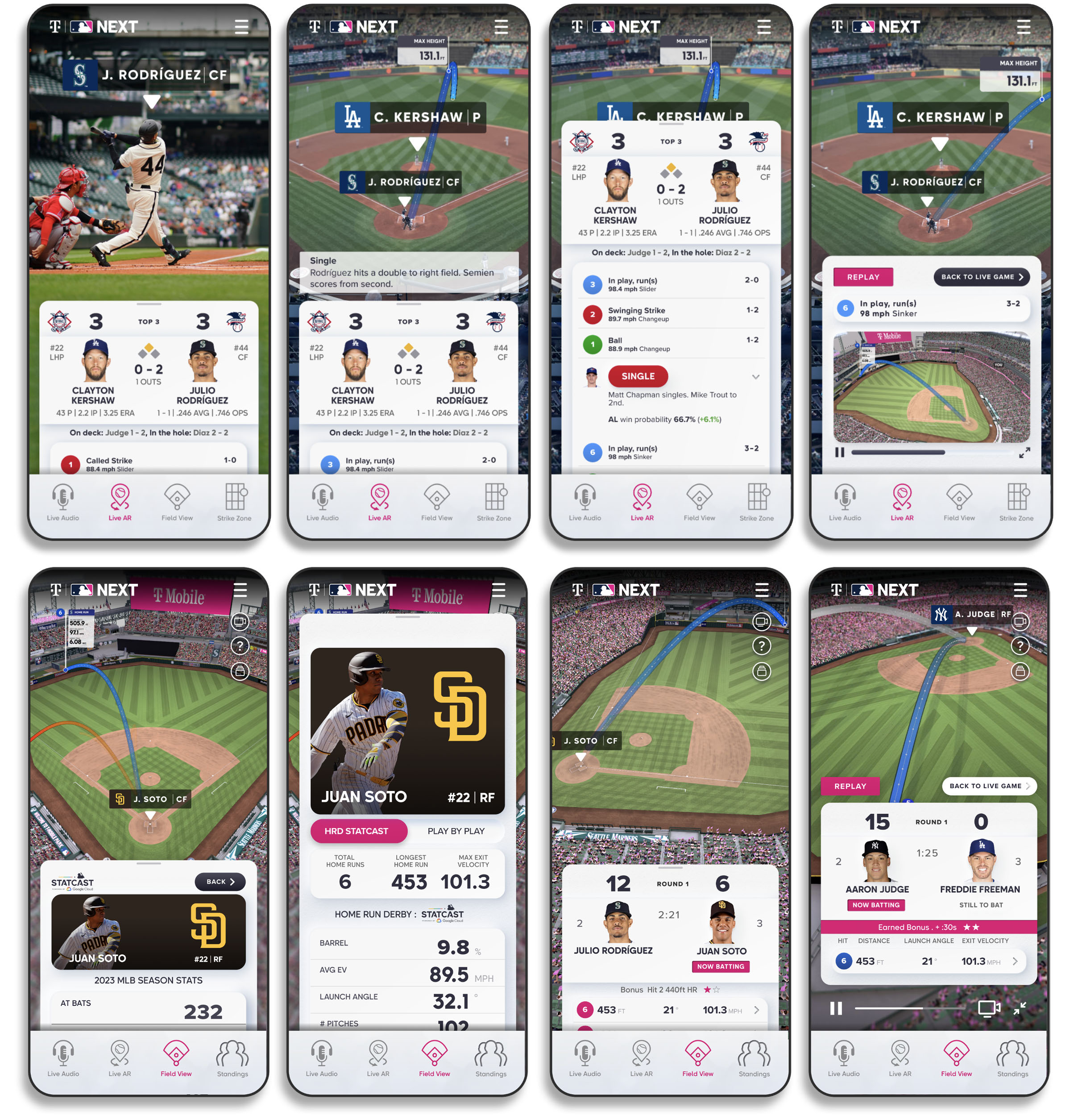 MLB Next, presented by T-Mobile, introduced real-time augmented reality to Major League Baseball for the very first time. Launched during the 2023 All-Star Week at T-Mobile Park, the app empowered fans with an unprecedented ability to explore pitch trajectories, follow ball flight, analyze defensive positioning, and access advanced stats — all overlaid directly onto the live field at 150 milliseconds (that’s 1/5th of a second!)